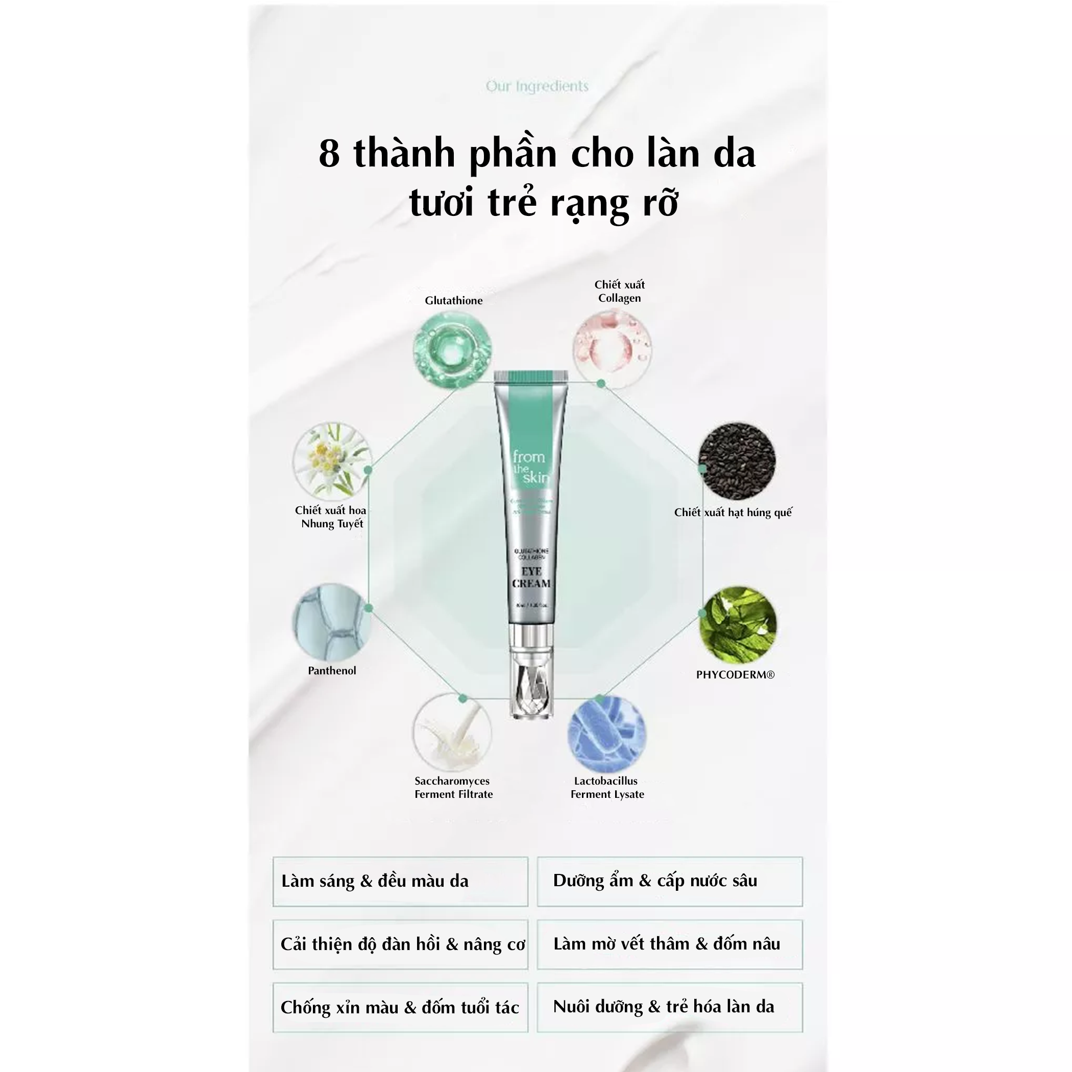 Kem dưỡng mắt Glutathione Collagen From The Skin 40ml là giải pháp chăm sóc vùng da quanh mắt hiệu quả, giúp giảm quầng thâm, làm sáng da, ngăn ngừa lão hóa và cấp ẩm sâu. Với công thức giàu Glutathione 3%, Niacinamide 2%, Collagen cá thủy phân, kết hợp với các thành phần phục hồi tự nhiên như Panthenol, Ginseng Extract và Ferment Lysate, sản phẩm giúp cải thiện toàn diện vùng da mắt nhạy cảm.